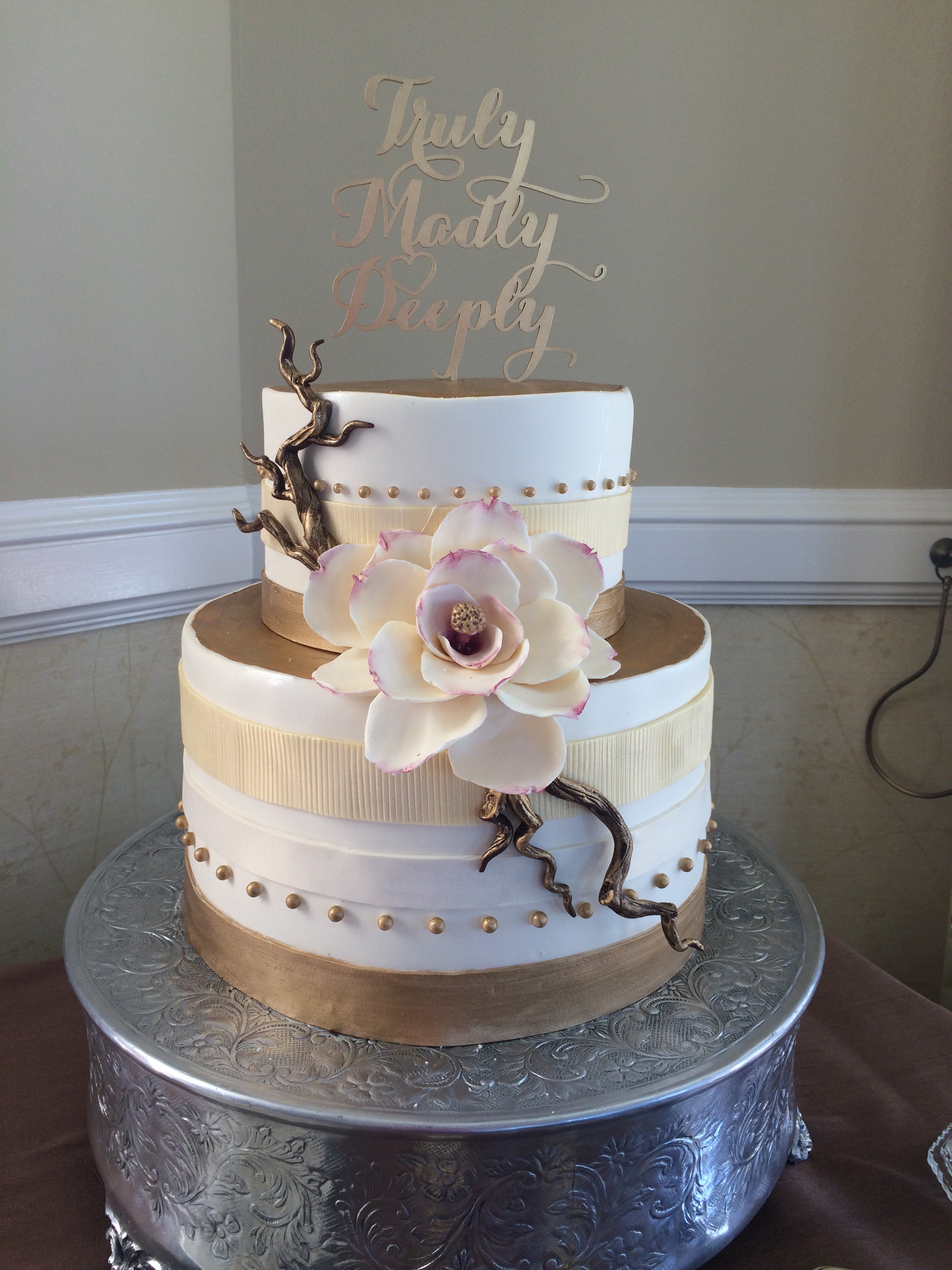 Two tiers is just fine with detail like this. Hand crafted magnolia with accents of gold for a special nuptial affair.